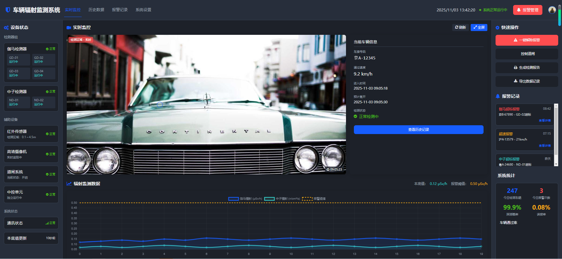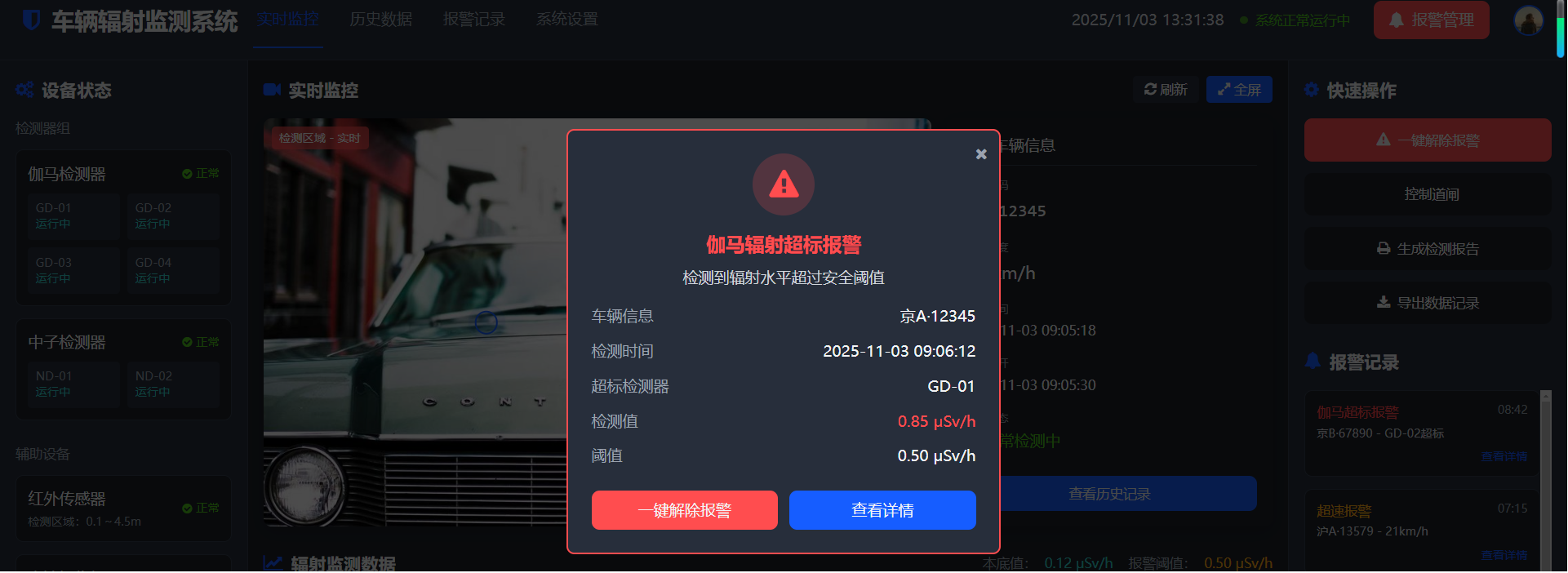 系統(tǒng)現(xiàn)場同時采用聲、光、電報警,伽瑪超閾值報警、中子超閾值報警、超速報警采用不同種類的報警燈予以區(qū)別,報警系統(tǒng)連接閘口保安亭,并聯(lián)動通道道閘檔桿落閘不予放行 |