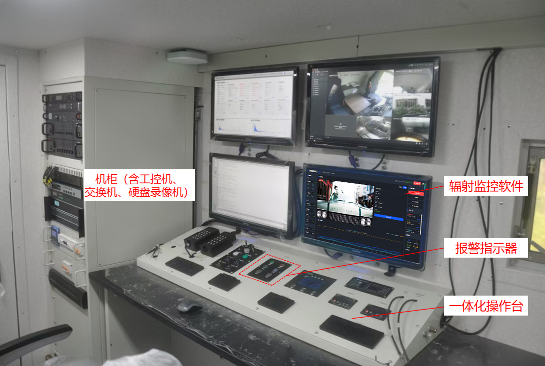 監(jiān)控中心配備一體化操作臺,配置工控機、輻射監(jiān)控軟件、交換機、硬盤錄像機、報警指示器,實現(xiàn)了在監(jiān)控室內(nèi)對現(xiàn)場情況統(tǒng)一監(jiān)測 |